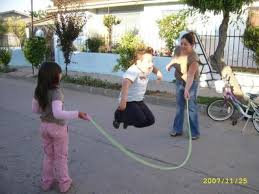 6/ El salto de la cuerda: Es donde 3 personas utilizan una cuerda. 2 personas baten la cuerda y el otro empieza a saltar asta que se enrrede la cuerda en los pies y hay pierde, y luego entra otra persona a saltar.